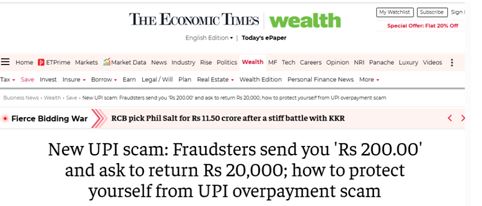 Image 1 ref: New UPI scam: Fraudsters send you 'Rs 200.00' and ask to return Rs 20,000; how to protect yourself from UPI overpayment scam - The Economic Times