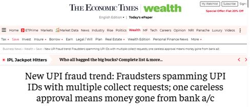 Image 3 ref: New UPI fraud trend: Fraudsters spamming UPI IDs with multiple collect requests; one careless approval means money gone from bank a/c - The Economic Times